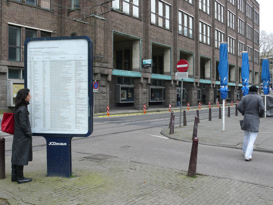 Between March 14 through March 28 2007, The List was displayed as a poster campaign in 110 outdoor advertising signs throughout the city of Amsterdam in close collaboration with curator Huib Haye van der Werf, Stedelijk Museum Bureau Amsterdam and SKOR