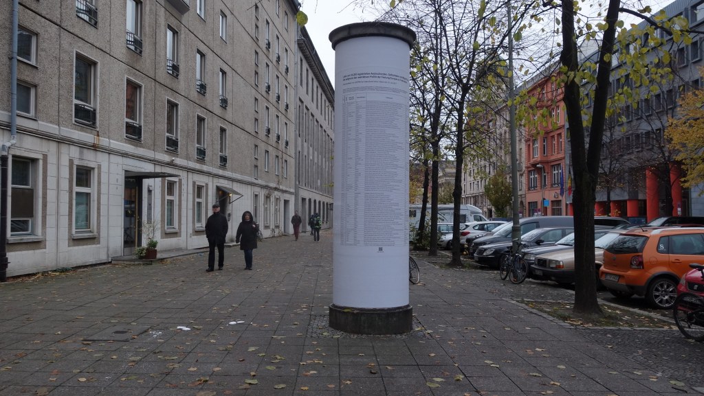 Between November 11- 20, 2017, as part of 3. Berliner Herbstsalon by Maxim Gorki Theatre, The List translated into German and compiled into 48 pages, was disseminated as a supplement in national daily newspaper Tagesspiegel (November 9/Berlin ed./100.000 copies), and simultaneously as a poster campaign in 48 surfaces in central Berlin. Der Tagesspiegel dated November 9, 2017–unsold copies of the daily run–, along with The List as their supplement was made available for free during the Herbstsalon.